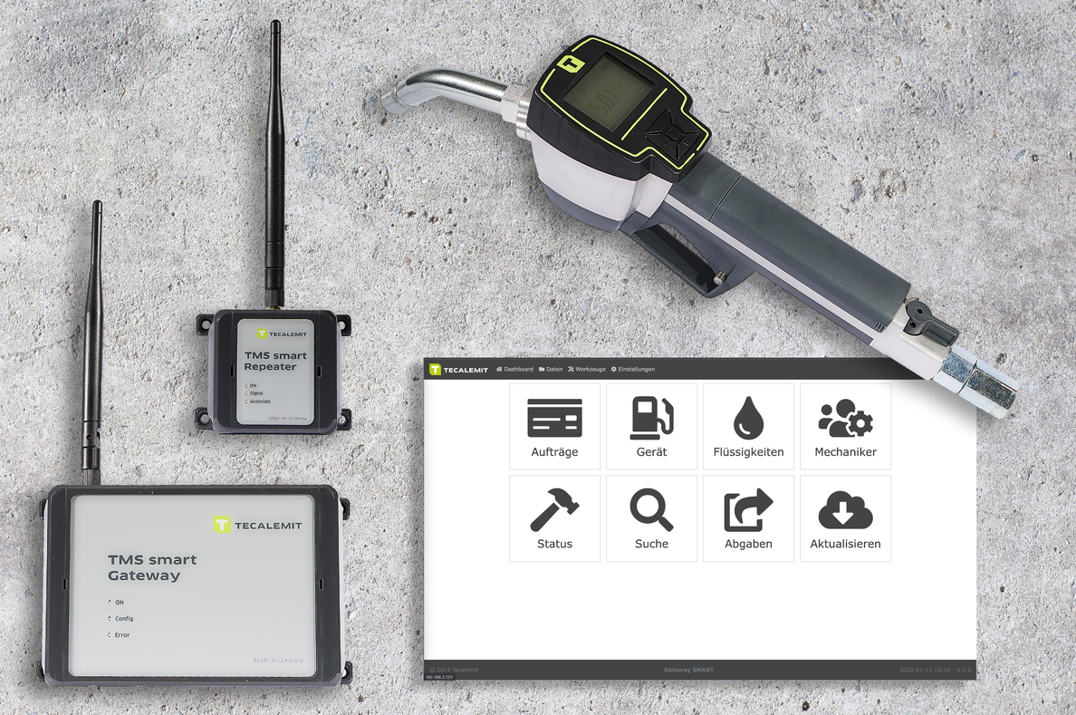 Das clevere Paket aus TMS smart Meter, Gateway und Repeater liefert aktuelle Tankdaten direkt an die vorinstallierte Software „TMS smart Control“. Sie möchten, dass sich der Anwender vor Bedienung des Tankvorgangs identifiziert? Auch das ist mittels berührungsloser Transpondertechnologie möglich. Das bedeutet für Sie: Mehr Kontrolle, Präzision und Transparenz — so geht kein Tropfen Öl oder Kühlerfrostschutz verloren!